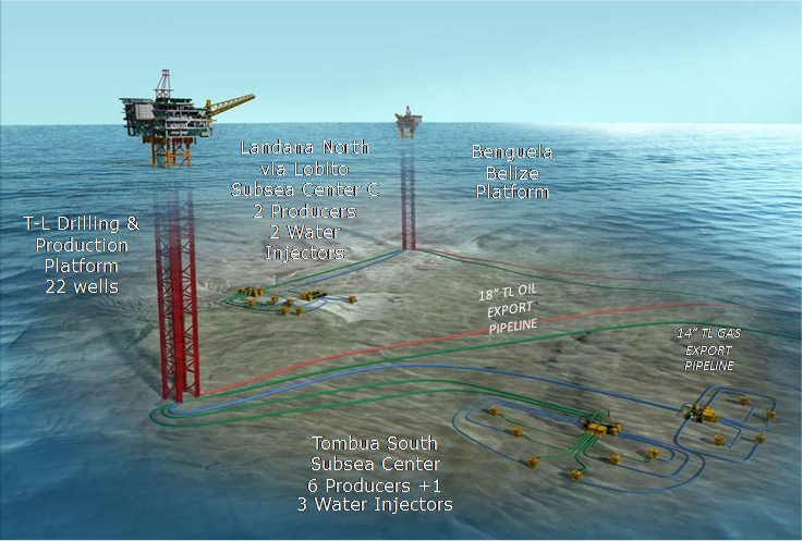 Tombua Landana fields were discovered in 1997 and 2001, respectively, by Tombua-1 and 14-6X/6XST1 wells. The fields lie in the eastern part of Block 13 and cover over 425 sq km in water depths of 900 to 1,700 ft. Geographically, they are situated just south of the Lobito field and north of the Gabela oil discoveries and are bounded by Block 0 to the east and 14 K/A-IMI Unit to the west. An additional 14 appraisal well penetrations were drilled to obtain a better understanding of the geology associated with each of the accumulations, further quantify reserves and evaluate development potential.